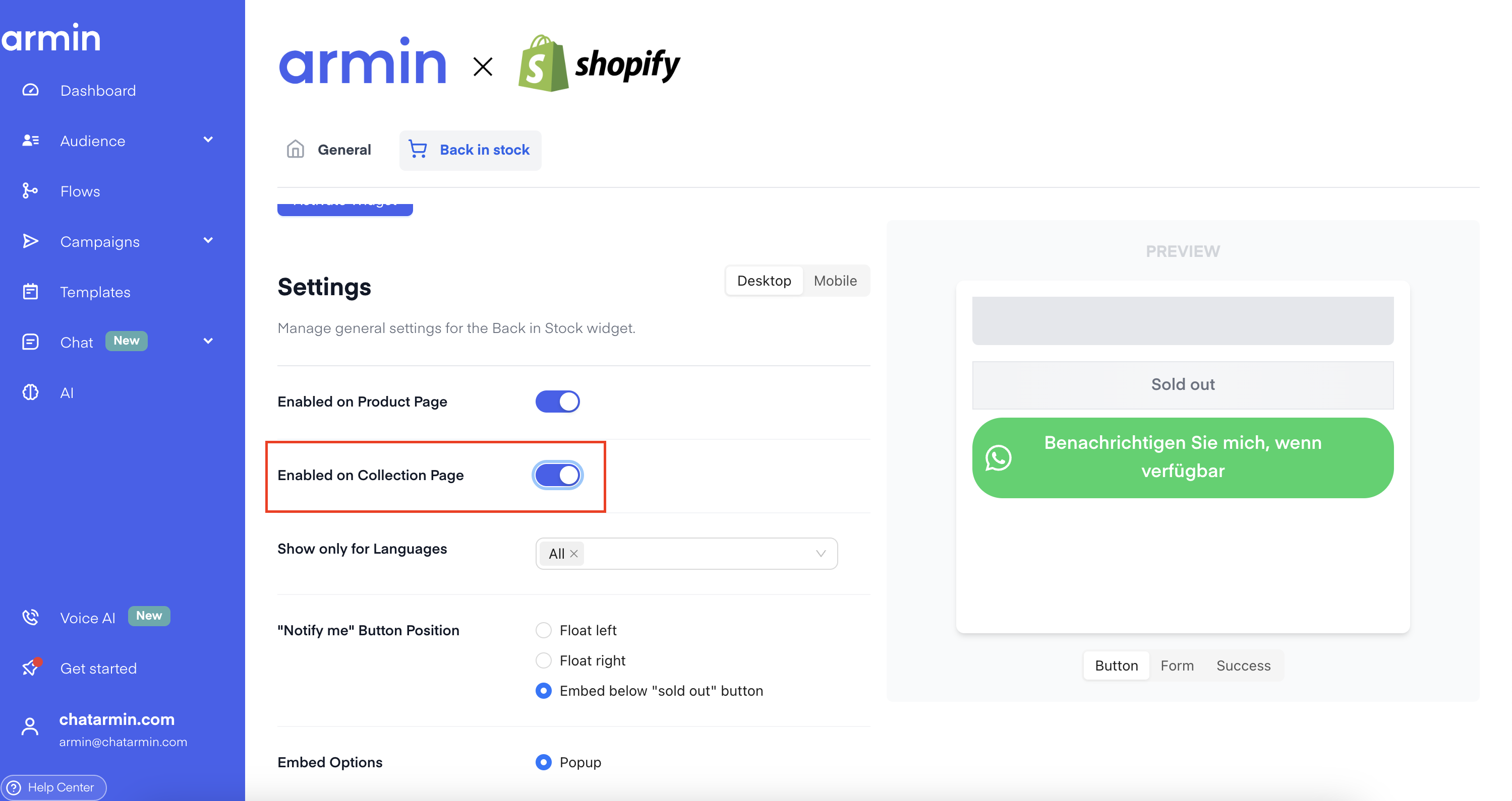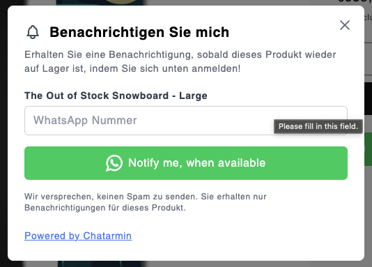 Doesn't matter what language/buzzword or if the customer has signed up through Mobile or Desktop. In Chatarmin you can create ONE Flow with the Trigger "Signed up for 'Back in Stock'":