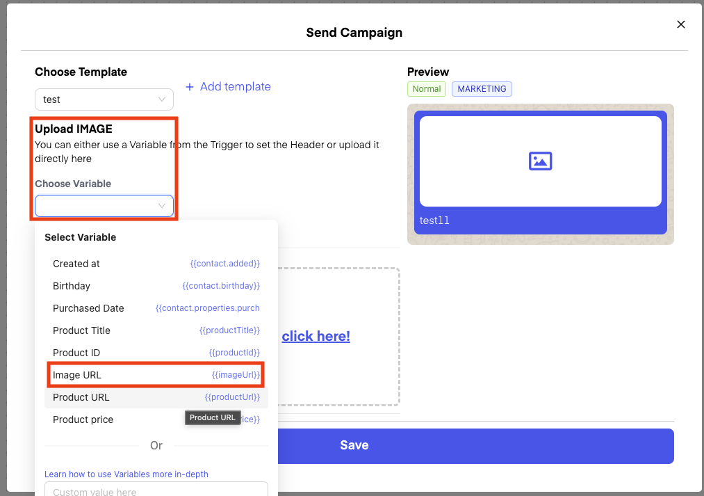 Since the Trigger can trigger for different Products, it also comes with "Variables" you can use for the Image or in Variables of a Template. So you can for example set the Image for a template like so: