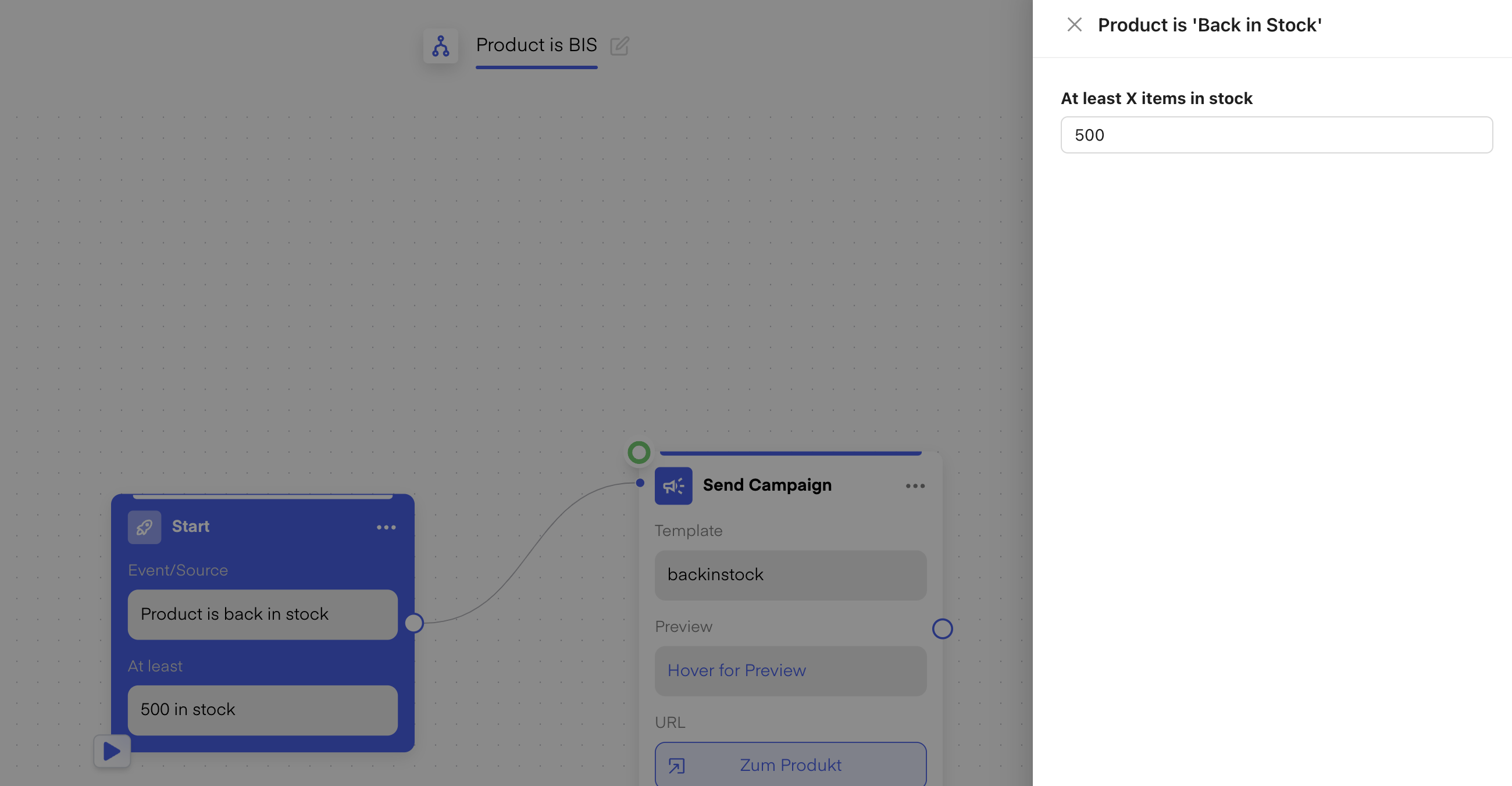 You can also customize when the Back in Stock notification is triggered, specifically in terms of the quantity of products that need to be back in stock before the notification is sent. You can adjust the settings in the Back in Stock flow so that the notification is only triggered when the stock level reaches a minimum threshold (e.g., 500 units). This ensures that the notification is sent only when there are enough items available, preventing messages from being sent prematurely due to small restocks (like a single returned item).