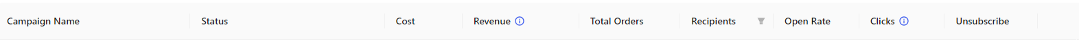 Campaign Name | Status | Cost | Revenue | Total Orders | Recipients | Open Rate | Click rate | Unsubscribe rate |