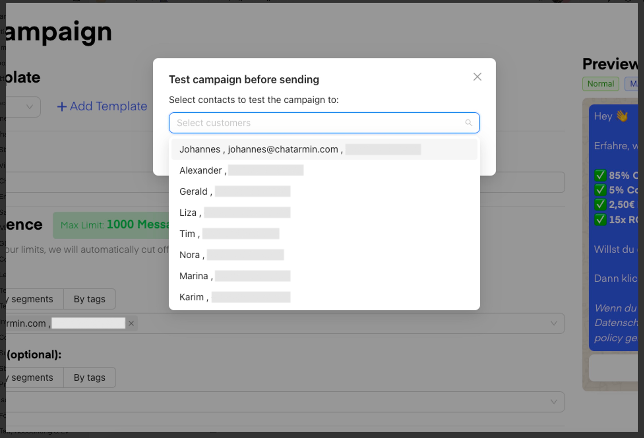 🚨Feel free to test your campaign before sendout. Simply choose the adressants and test your campaign, before blasting it out to your list 🤓