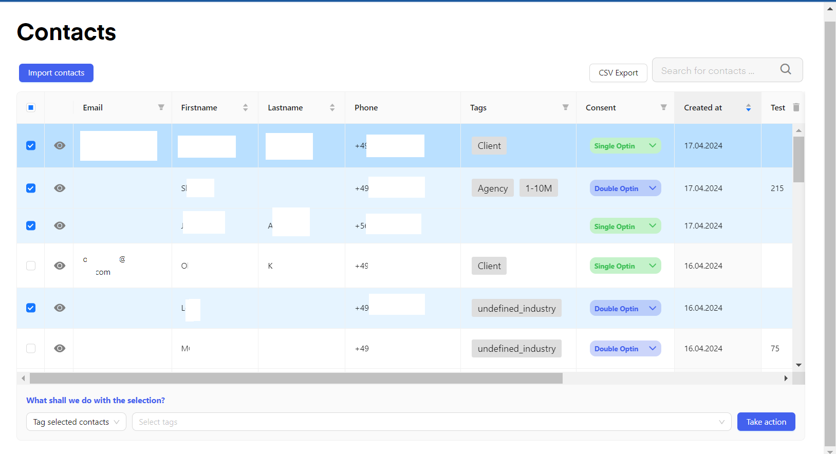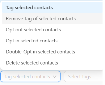 You can bulk edit your contacts by clicking on the boxes to the left of the contacts. You can then choose from the dropdown menu how you want to edit the chosen contacts. Optionally choose the tag you want to add/remove and click "take action".