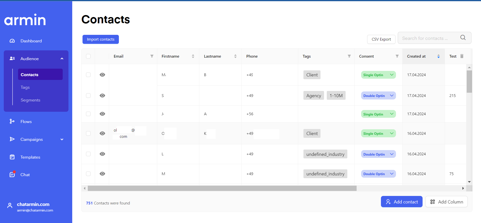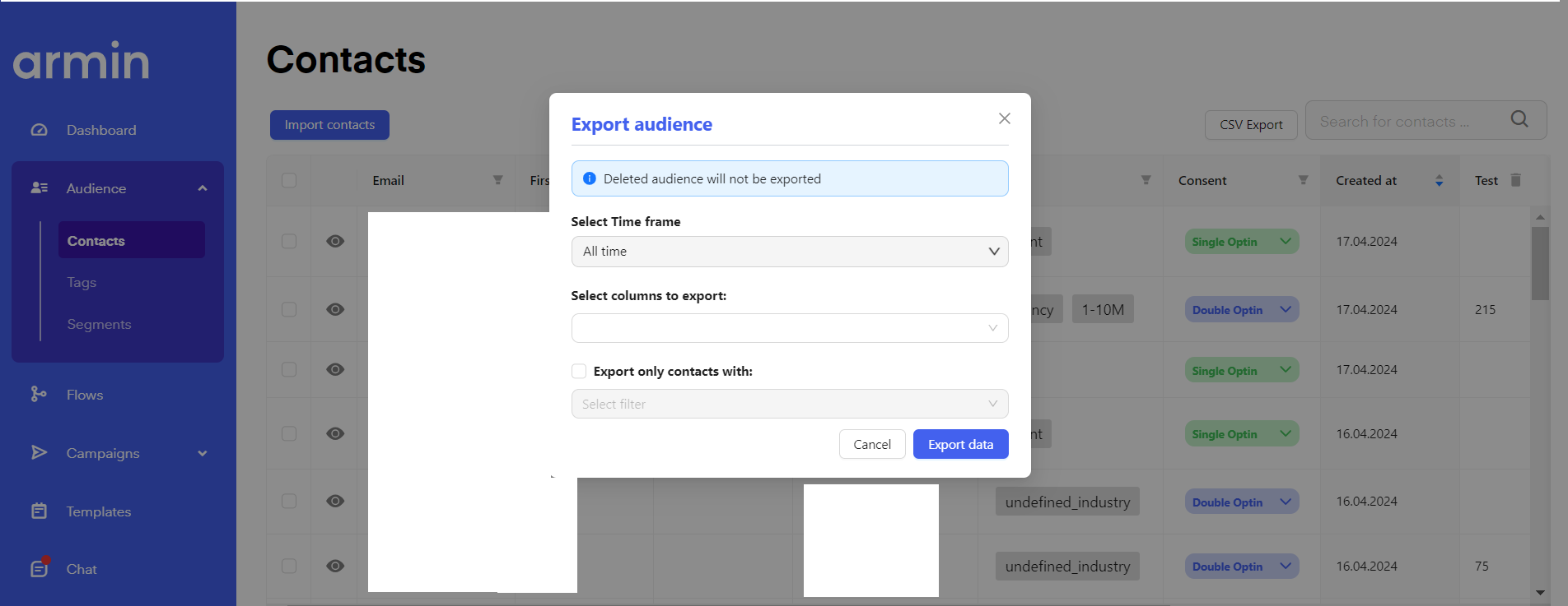 You can manually export your Chatarmin to use them as a CSV file or import them into other tools by clicking "CSV Export". Then choose which timeframe you want to export your audience from, which columns you want to export, and optionally whether you want to export specific Tags or Segments.