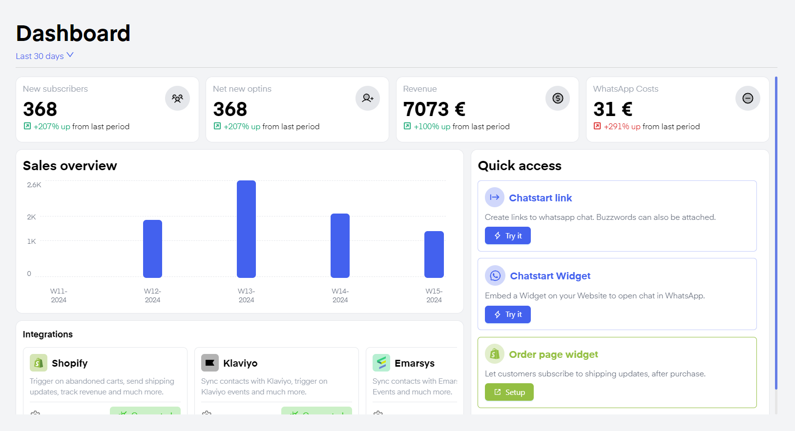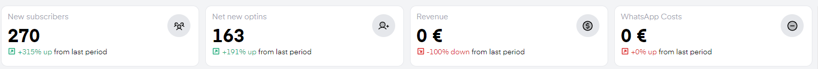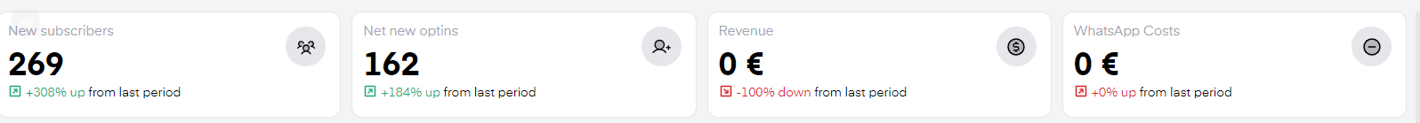 The statistics displayed are "New subscribers". It refers to all users who have entered your Chatarmin CRM in the chosen timeframe. "Net new optins" refers to all users who have given their Opt-in consent in this timeframe. "Revenue" refers to all generated revenue by using the Chatarmin tool in your shop. To understand how Chatarmin attributes revenue, click here. WhatsApp Costs refers to your conversational "META-Costs", excluding Chatarmin costs.