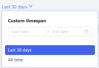 On the top, you can switch the timeframe, for which the statistics of the Dashboard are displayed. It is set to "last 30 days" by default but you can switch to "all time" or to a "custom timespan" anytime.