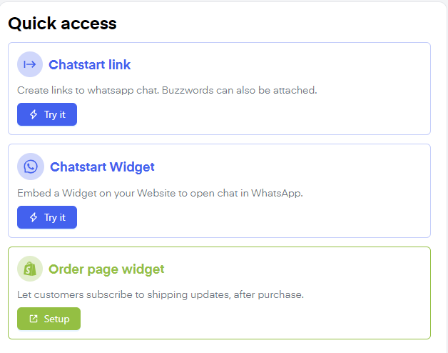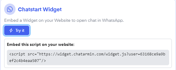 By clicking "try it" by the "Chatstart Widget" symbol, you will be shown a script that you can embed into your website to display a chat-in bubble. This way your customer can get in contact with you for customer support requests via WhatsApp. This helps create trust and successively convert your lead into a marketing lead.