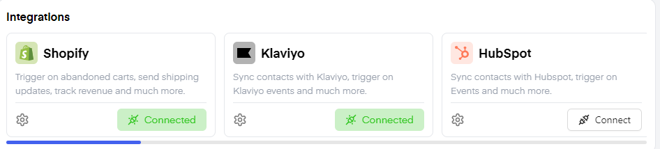 On the bottom of the "Dashboard" feature, click on connect on any integration to connect the tools you already use within your shop to natively integrate them into your "Chatarmin" workspace. Once you click "Connect", you will be forwarded to a step-by-step tutorial, explaining how to connect the specific integration.