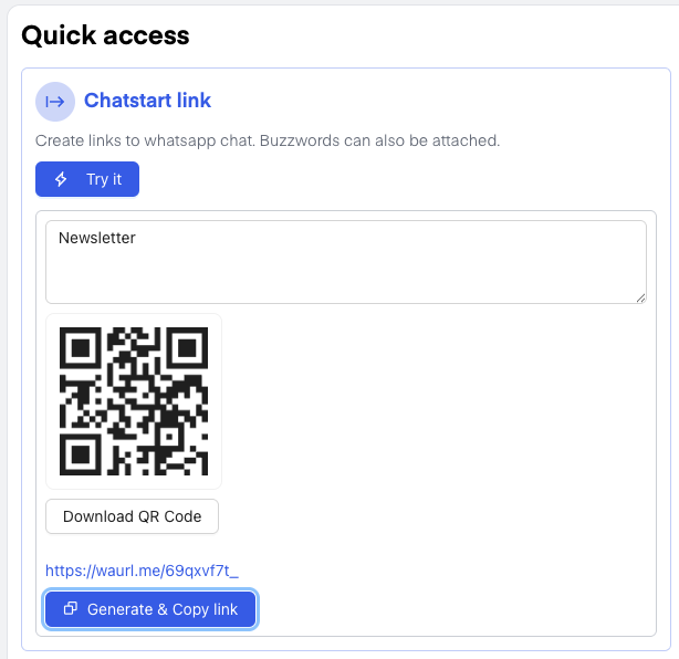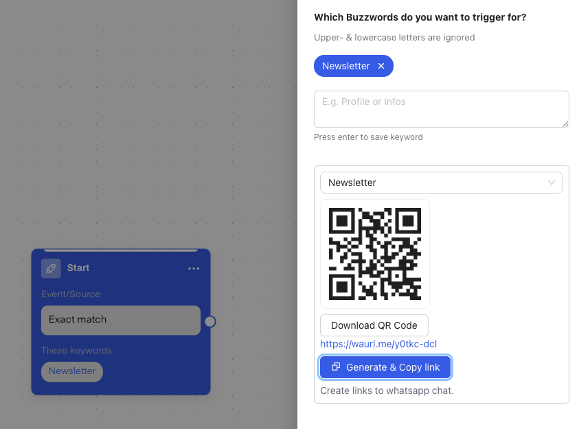 You can also go into any existing flow, choose the Trigger step, select a buzzword, and generate a link and QR code directly from there. Ideal for quick flow testing!