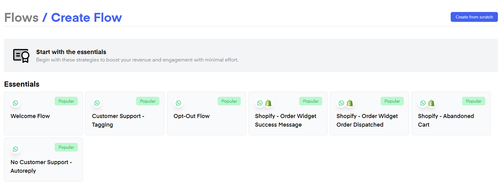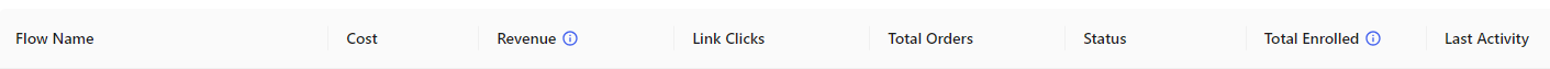 On the top of the page, you have a search bar to find your flows easier as well as basic statistics such as "Total Enrolled" "Generated Revenue" "WhatsApp Costs" and "Unsubscribe rate".