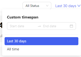 In the "Flow interface", you have an overview of all your flows. Similar to the "Dashboard" feature you can also switch from showing "Flows" of the "last 30 days" to "all time" or a "custom timespan". In addition to this, you also display only "Active" "inactive", or "All Status" Flows.