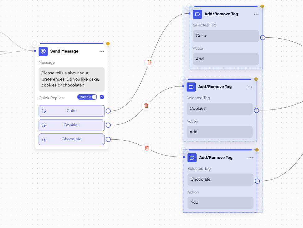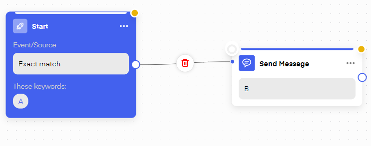 You can delete a connection between two actions by clicking on the connection and clicking on the bin icon.