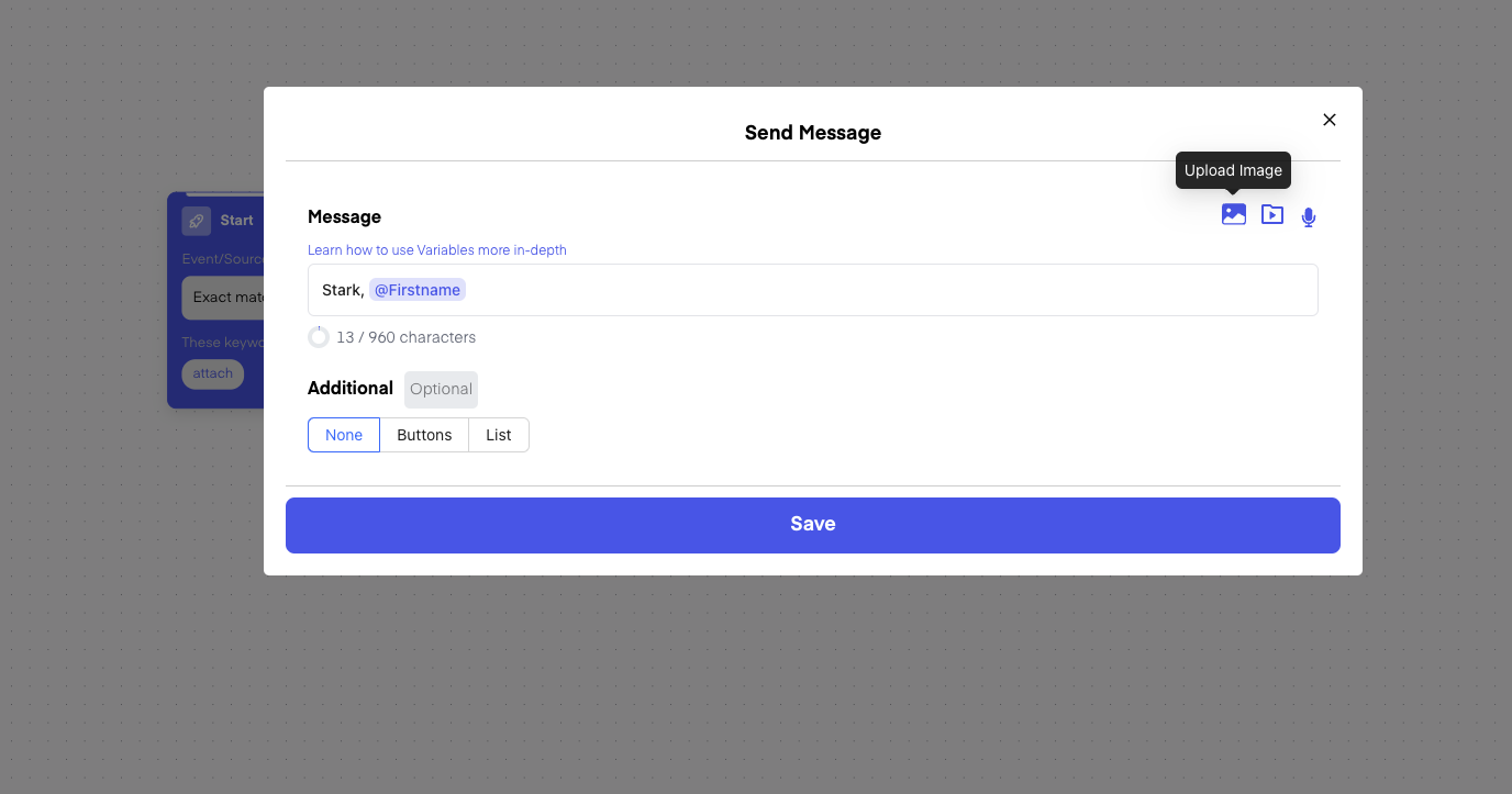 You can also send Images, Videos and Audio Messages in a Flow. Choose the Action -> Send Message and then on the right you can select what Media you want to add to the message: