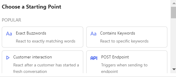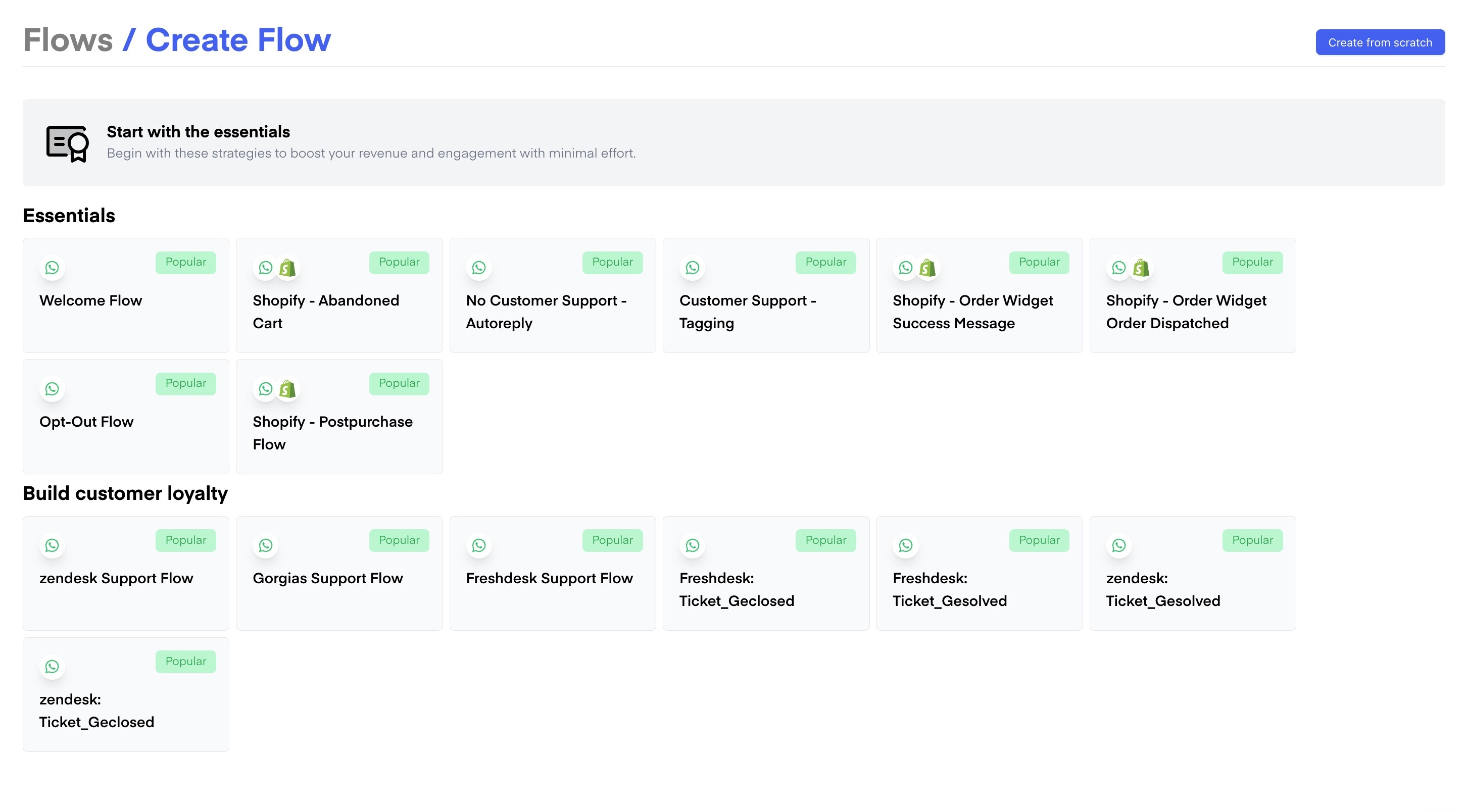 .. as well as advanced flows shown below, such as our "build customer loyalty" support flows, funnelling clients' tickets into Gorgias, Freshdesk, zendesk and Co., through our dedicated pre-built flow templates: