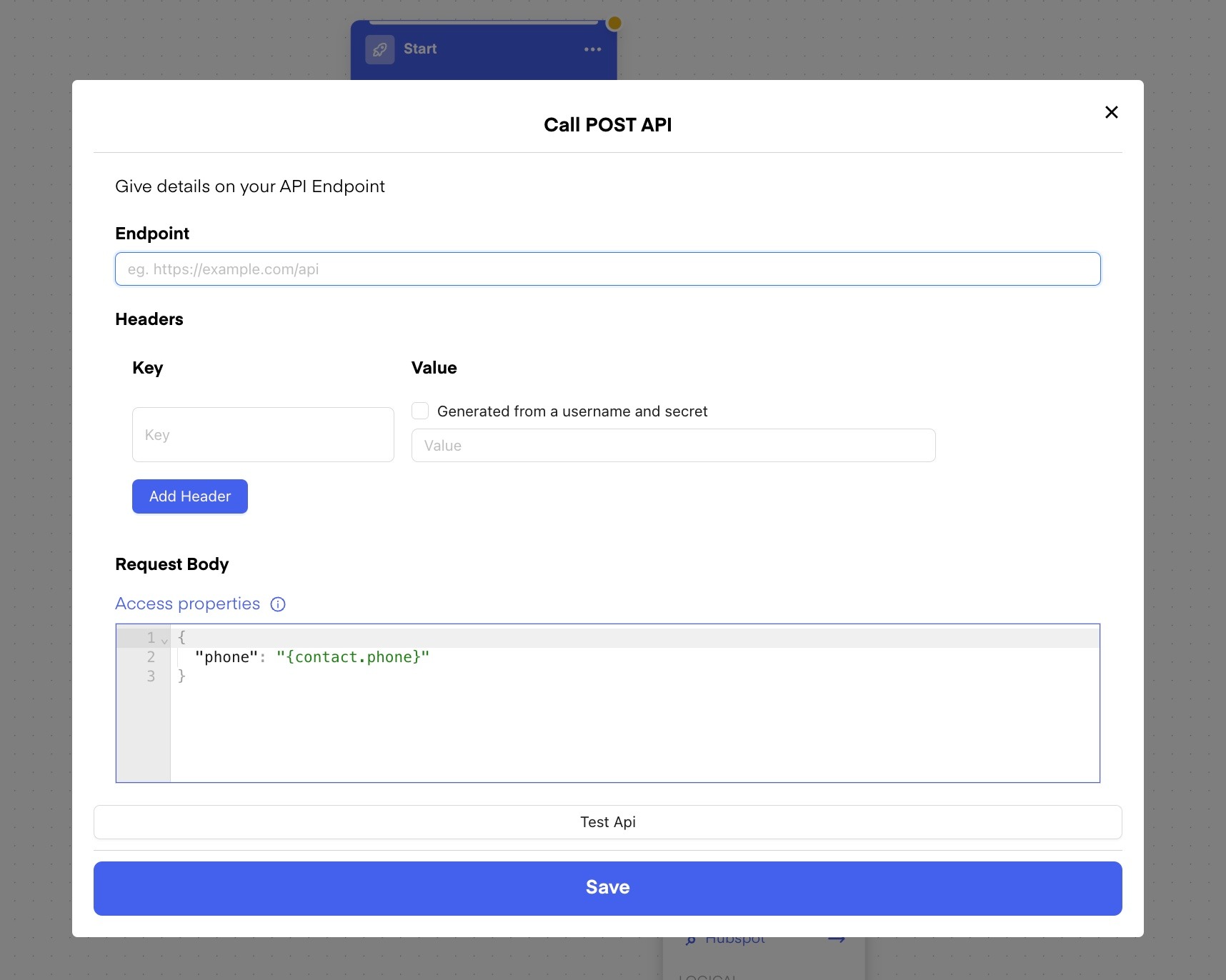 For example, when a user takes an action in your WhatsApp flow (like filling out a form), the flowbuilder might call a POST API to send that data to your CRM or another service for further processing, like saving the info or triggering an action.