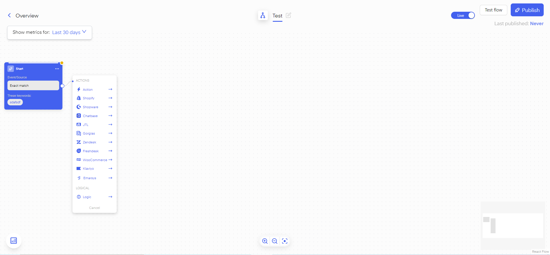 "Flows" are actions used to automate your customer interactions. A "Flow" always has an initial trigger and successive actions.