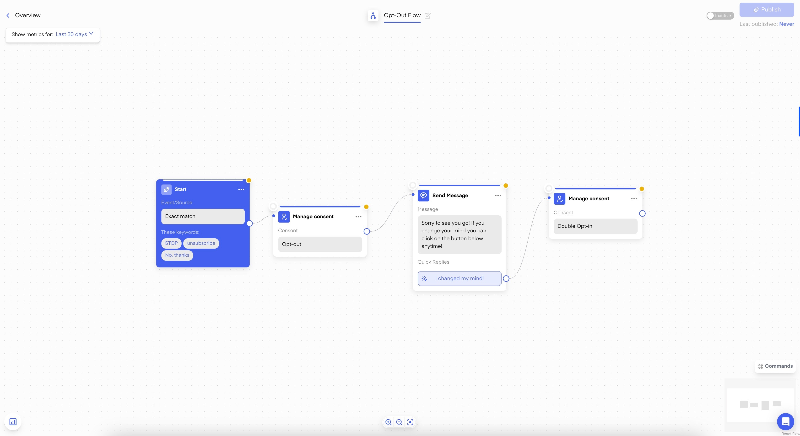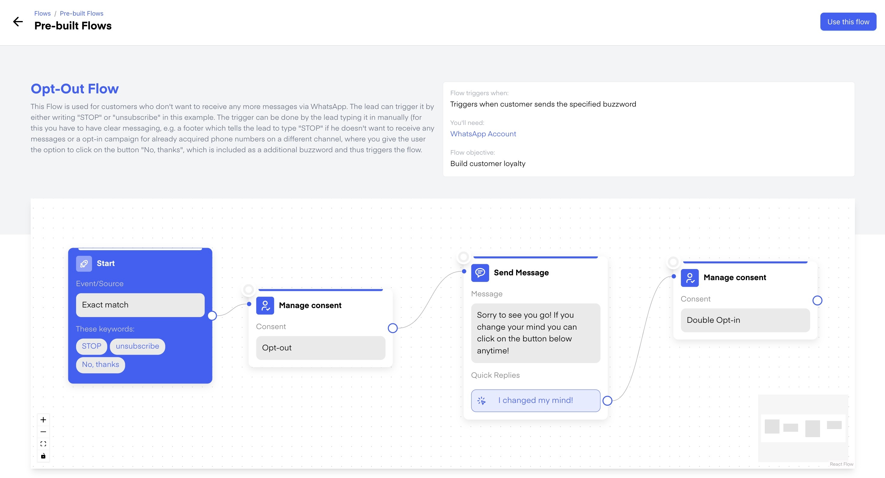 Chatarmin's flow-dashboard provides a template for optout flow, to enable your leads to unsubscribe from your WhatsApp-activities as per buzzword. Simply use "contains" or "exact match" buzzword and use the "flow action" -> "manage consent" -> "Optout".