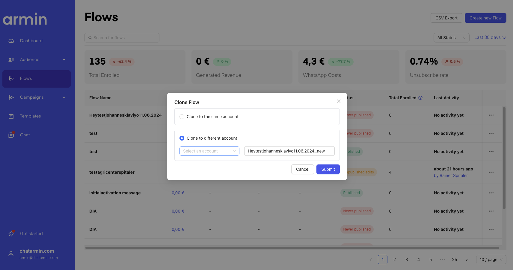 This is how you duplicate flows between accounts, if you are to manage Chatarmin-dashboards for multiple brands.