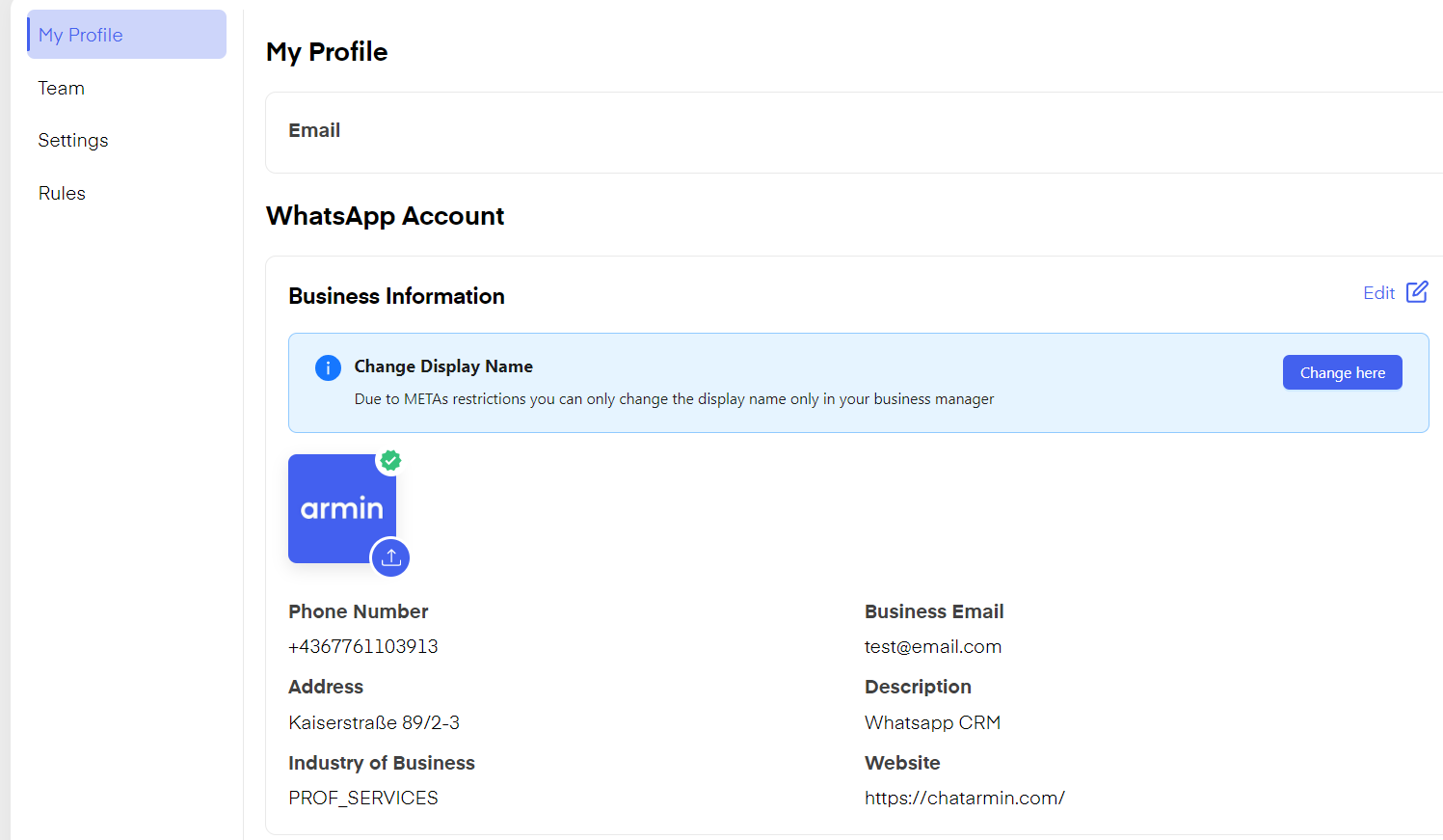 You can click "My Profile" to set your WhatsApp picture edit your company info and description, and edit your status displayed on WhatsApp by clicking "Edit".