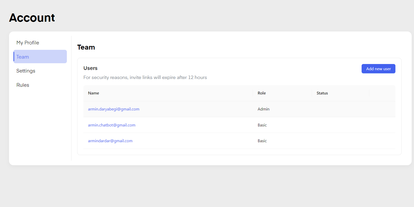 Click on "Team" to add or remove users to or from your team. The user is added via Mail-Invitation and receives a valid link for 12 hours until it expires, if the user does not accept the invitation the admin has to remove the user and resend the invite.