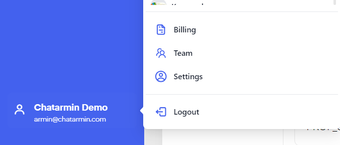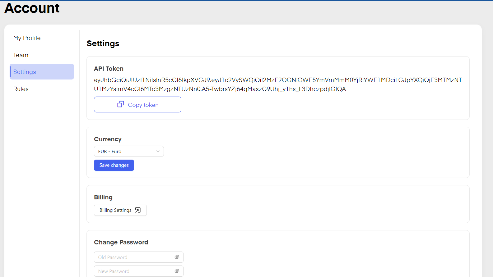 By clicking on "Settings" you can see your API Token, change the currency displayed in your Chatarmin Account, see your "Billing Settings" and change your Password.