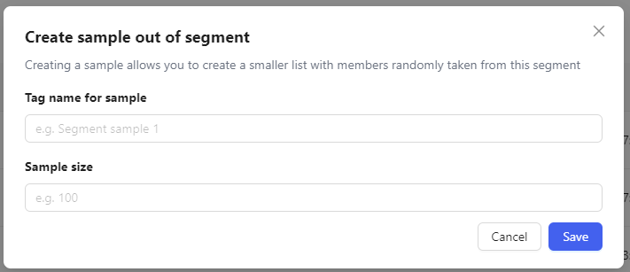 By clicking on the three dots and clicking "Create sample" you can create a specific sub-segment by creating a sample size. E.g. If 1000 users are in a segment and you create a sample of 100, you will create a subsegment with 100 randomized users of the previous segment. This can be useful to test campaigns on a smaller sample size.
