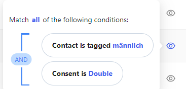 You can then choose to match "any" or "all" conditions. If you choose "any" a lead will be included in the segment if he/she matches one or more of the given conditions. If you chose "all" the lead will only be included if he/she matches all of the given conditions.