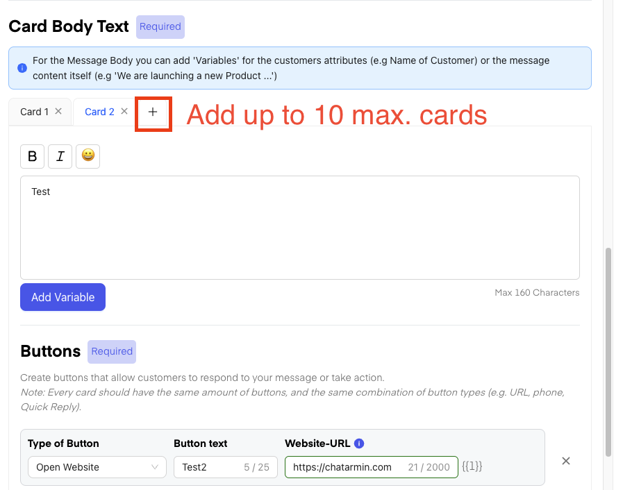 The Buttons chosen will also be used for EVERY Card. You can only change the Website-URL for each Card, when actually using that Template in Campaigns or Flows.