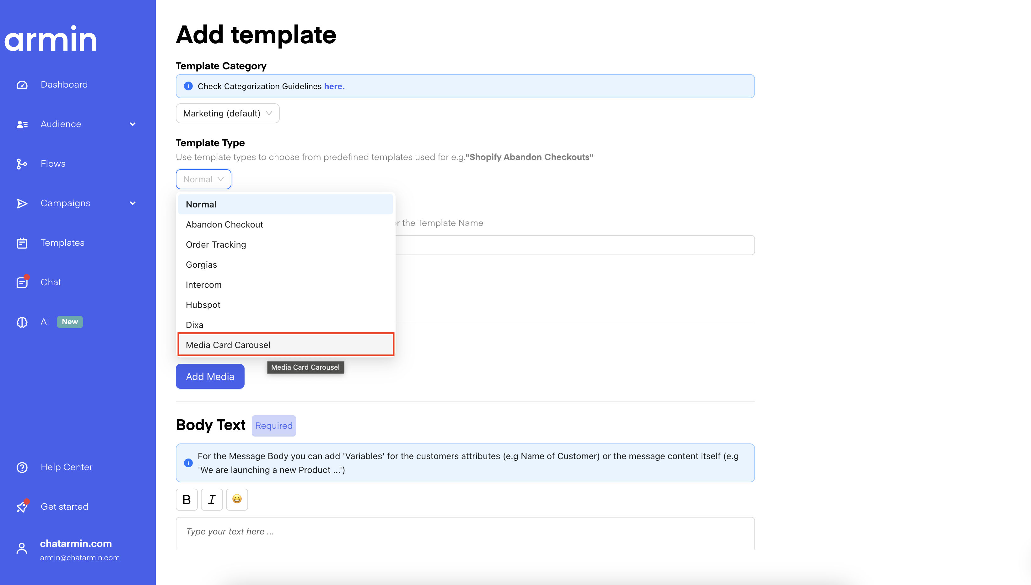 First of all, you will need to choose the "Media Card Carousel" as the Template Type.