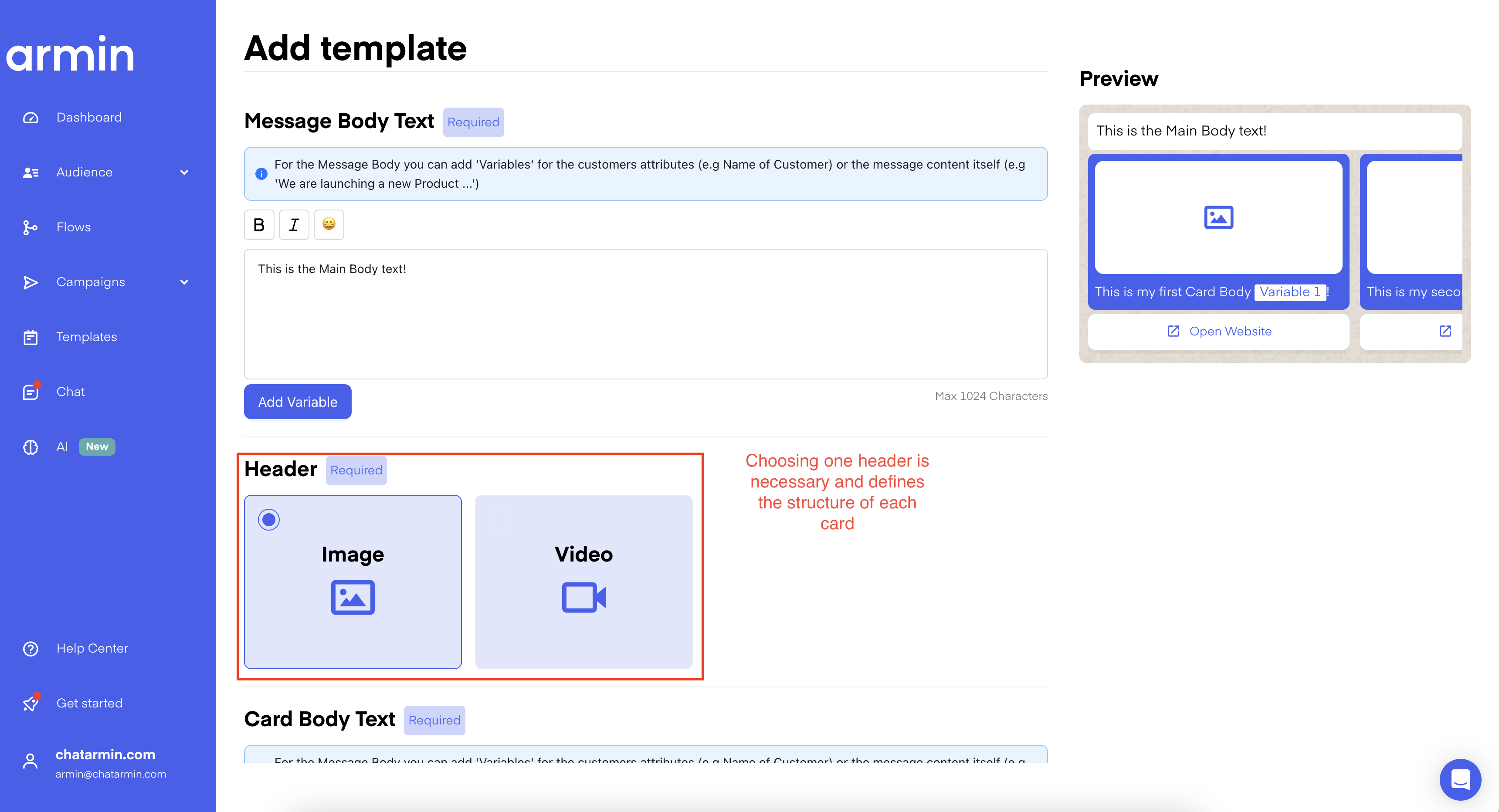 After that, you will need to pick a Header. Either Image or Video. With choosing a Header, every Card used in this Template, will then have this type of header. Same Header-Type for every Card.
