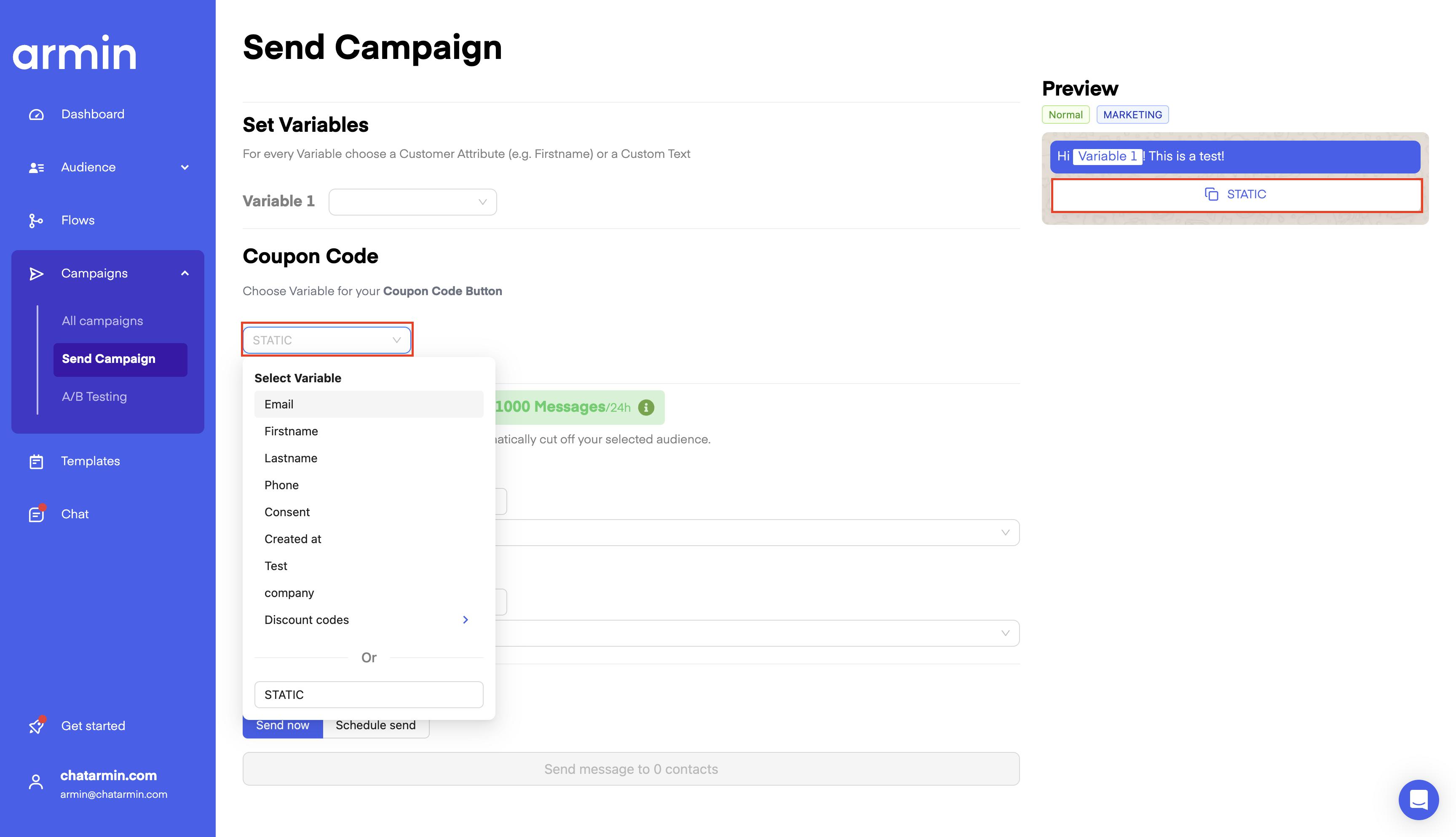 Simply choose the Template and specify a Variable/Text for the Coupon Code: