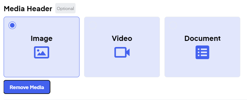 Optionally add a "Media Header". You can include Images, Videos, or Documents here. For now, this will only be a placeholder. You will upload the final file once you insert the campaign into a flow or send it as a campaign.