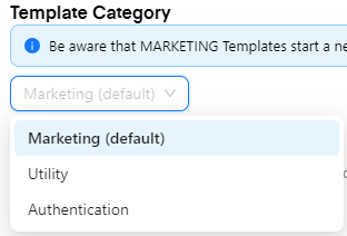 First, you will have to choose a "Template category". You can choose between Marketing, Utility, and Authentification. Be aware that MARKETING Templates start a new conversation. Check the Categorization Guidelines here.