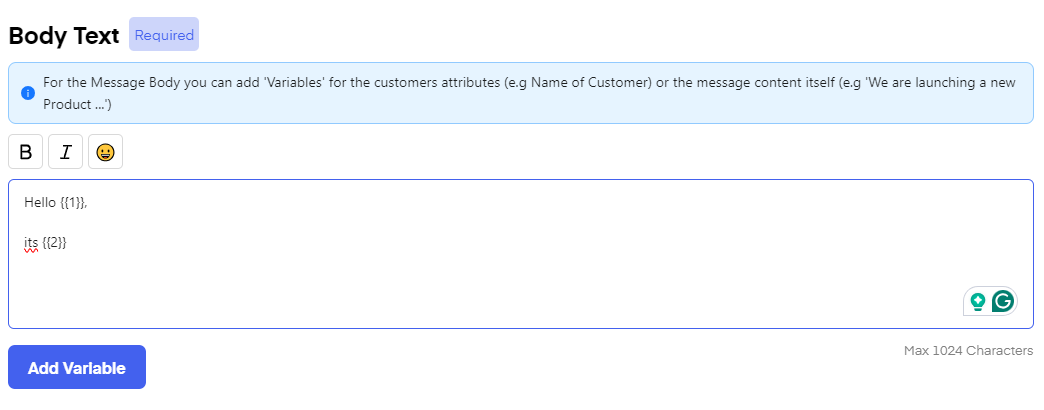 In the "Body Text" input the text of your campaign. You can see changes on the right-hand side in the preview. You can use bold text, italics, and emojis here. You can also set "Variables" here, the variables will only stay as placeholders for the number of variables and their location, similar to the "media header" you will designate the variables when using the template inside of "flows", "campaigns" or "chat".