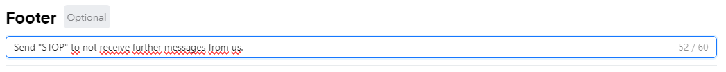 In the "Footer," you can optionally include a greyed-out message. Here you can include your socials or a GDPR-compliant option for the user to opt-out at any time, e.g. "Type "Stop" to opt out at any time", or to make the user attentive that certain discount codes only work from a certain minimum-purchase-amount.