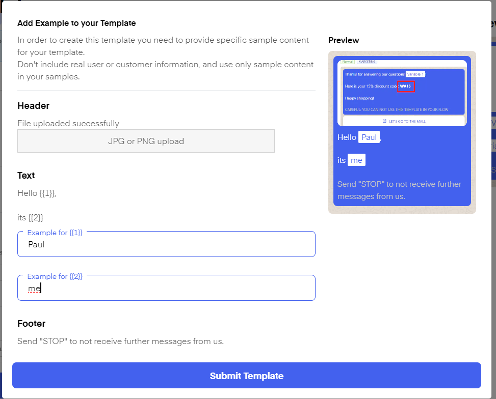 Once you click "Save template" you will be asked to send examples of your Media and variables. These are only examples to be verified by META, the final images, as well as variables, will be chosen once you include the campaign in a flow, send it via chat, or send it as a campaign.