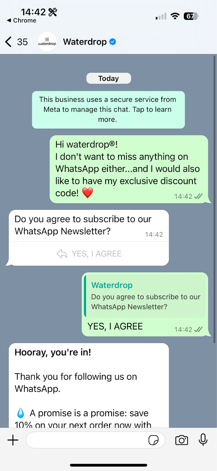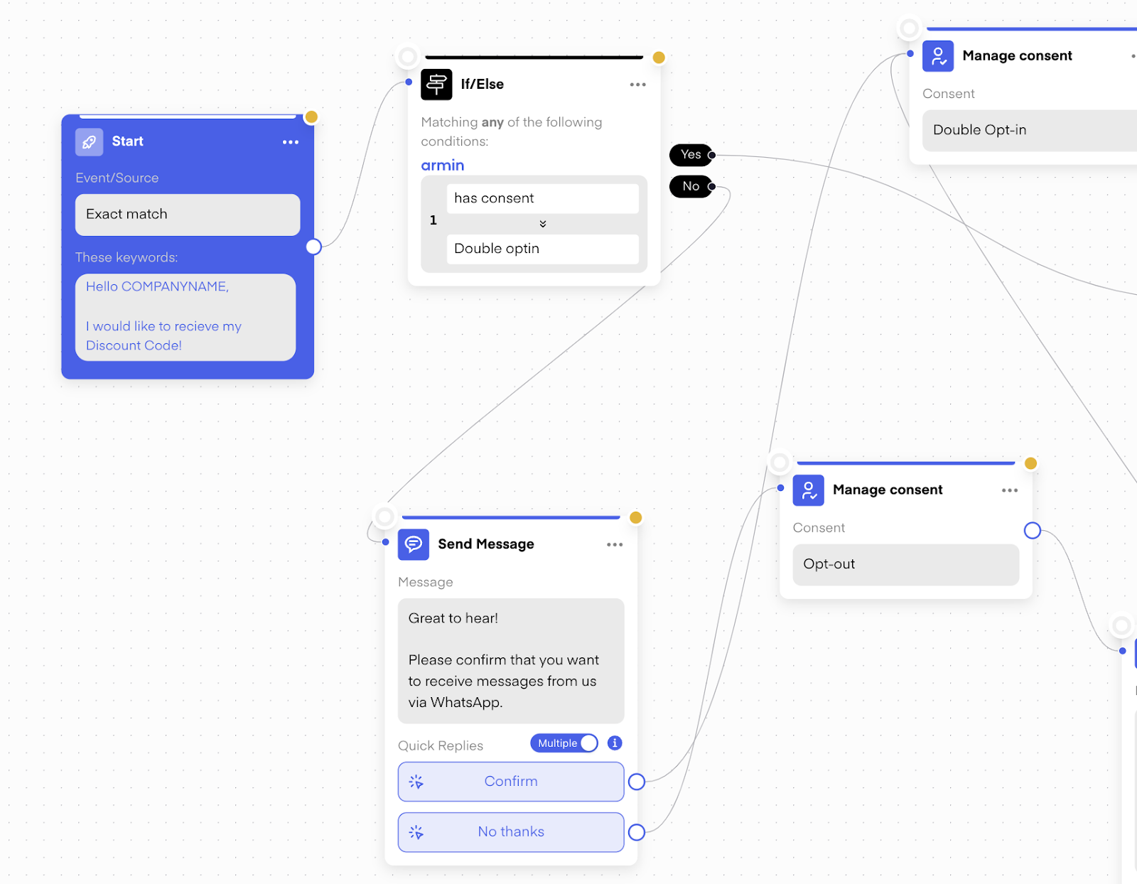Double Opt-In Flow: After the trigger message was sent successfully the double opt-in flow starts. If the user accepts to receive messages on WhatsApp (e. g. bei START / YES) you have a proper double opt in – and from now on can send marketing messages to the user.