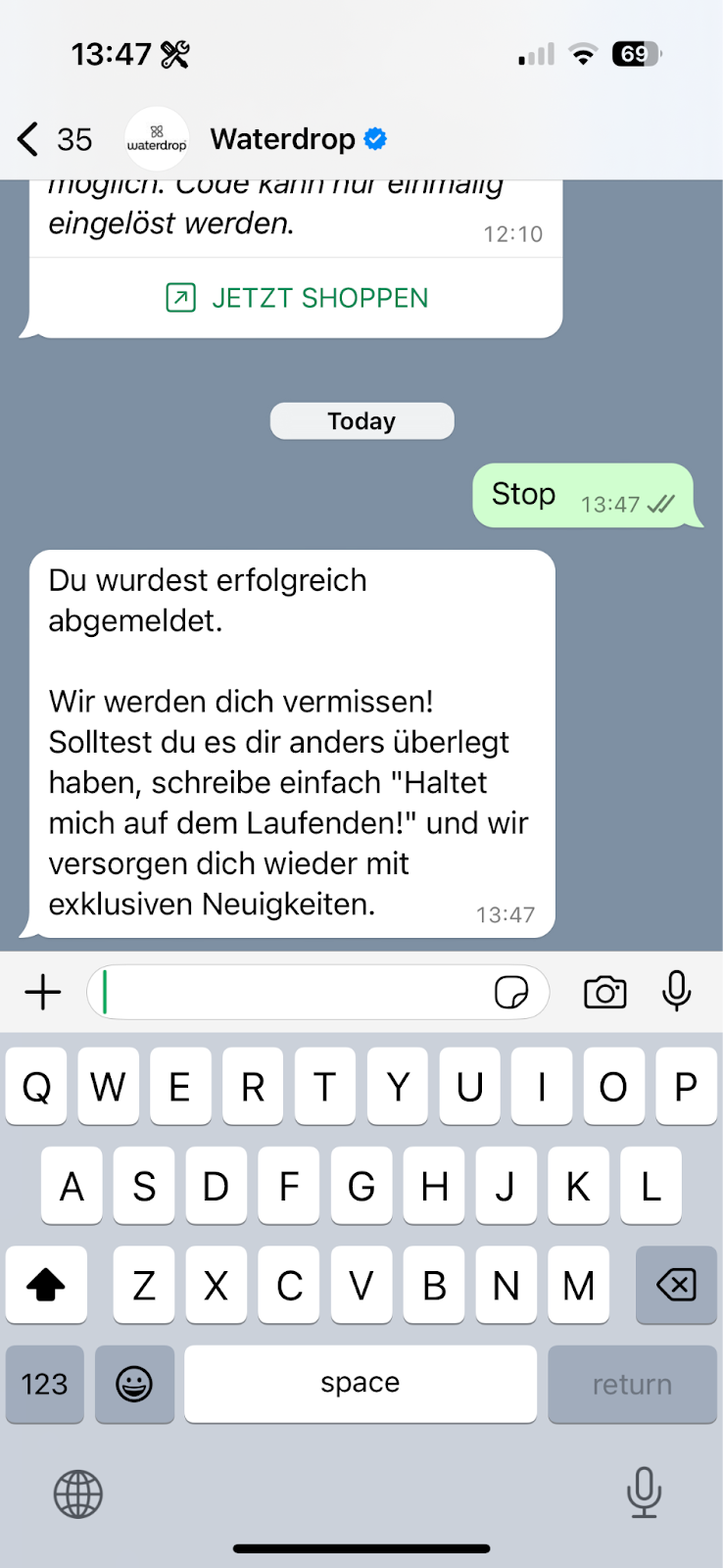 Provide a clearly visible unsubscribe notice in every message with clear wording, such as: “Don’t want to receive further messages? Write STOP.”