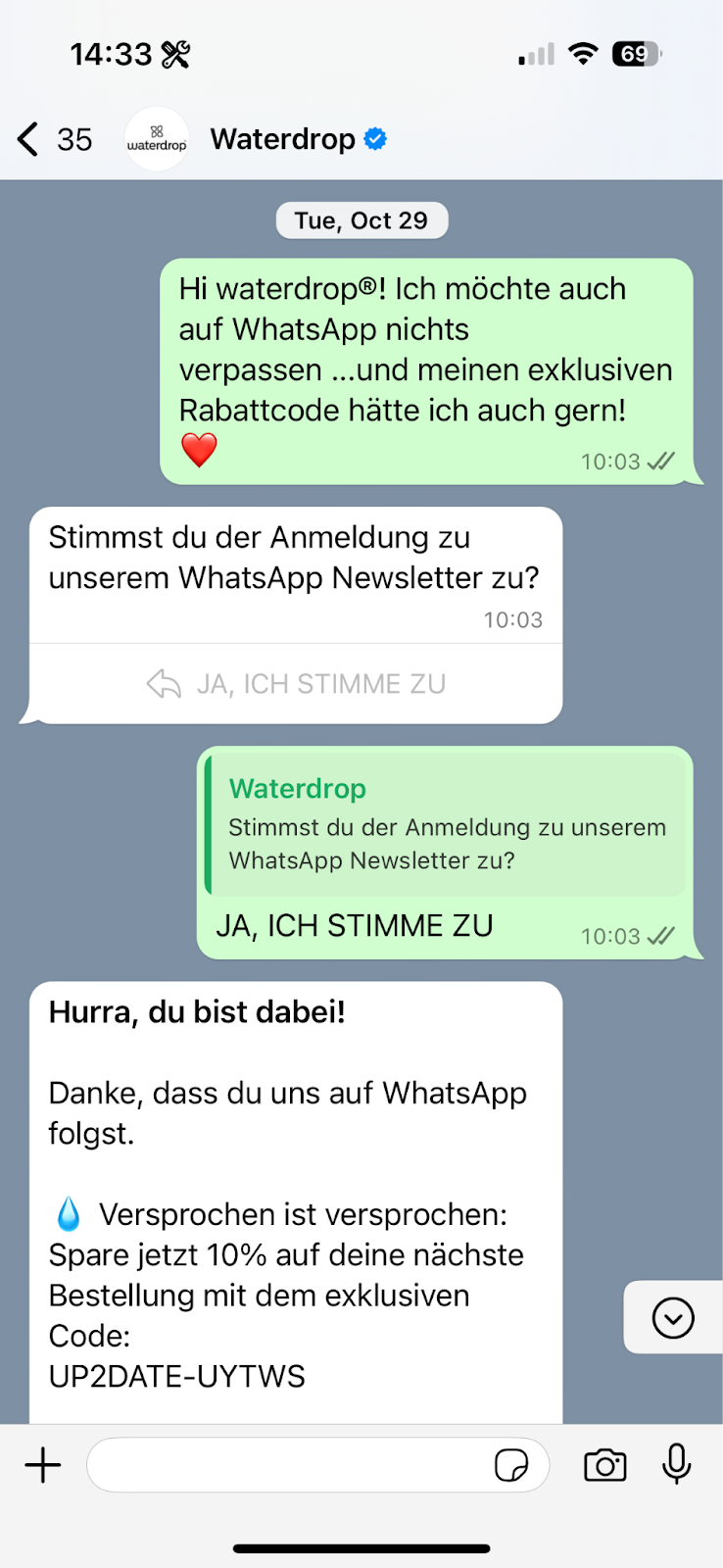 In this context, we process the following personal data: telephone number, WhatsApp profile name, and communication and click behaviour in the chat.