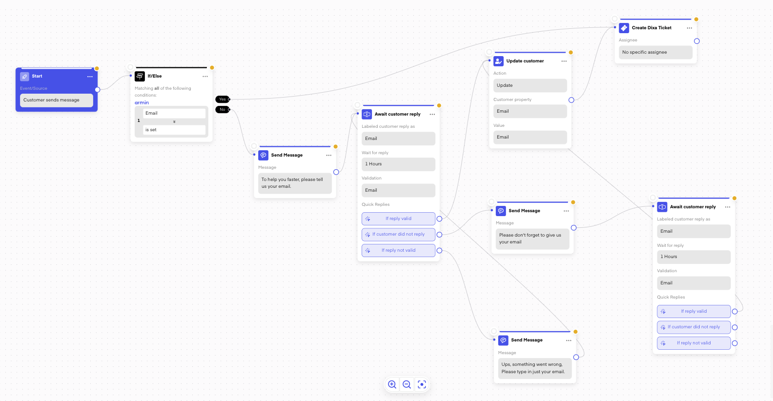 To make DIXA support more efficient through Chatarmin, it's ideal to collect the customer's email before creating the DIXA ticket. We can achieve this by setting up a flow like the one outlined below. Please feel free to adjust the flow steps according to your specific use case.