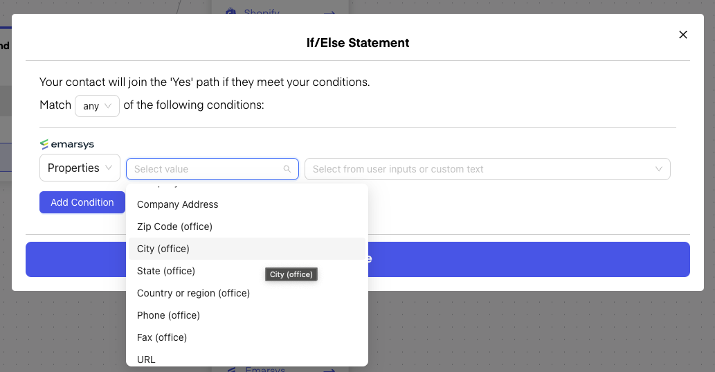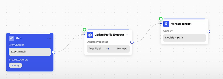 Here's how you can add properties to your Emarsys account. We can automatically add properties to an Emarsys account depending on the user's behavior. Depending on which branch of the flow the user goes through we can Update the Emarsys profile with a property we determine.