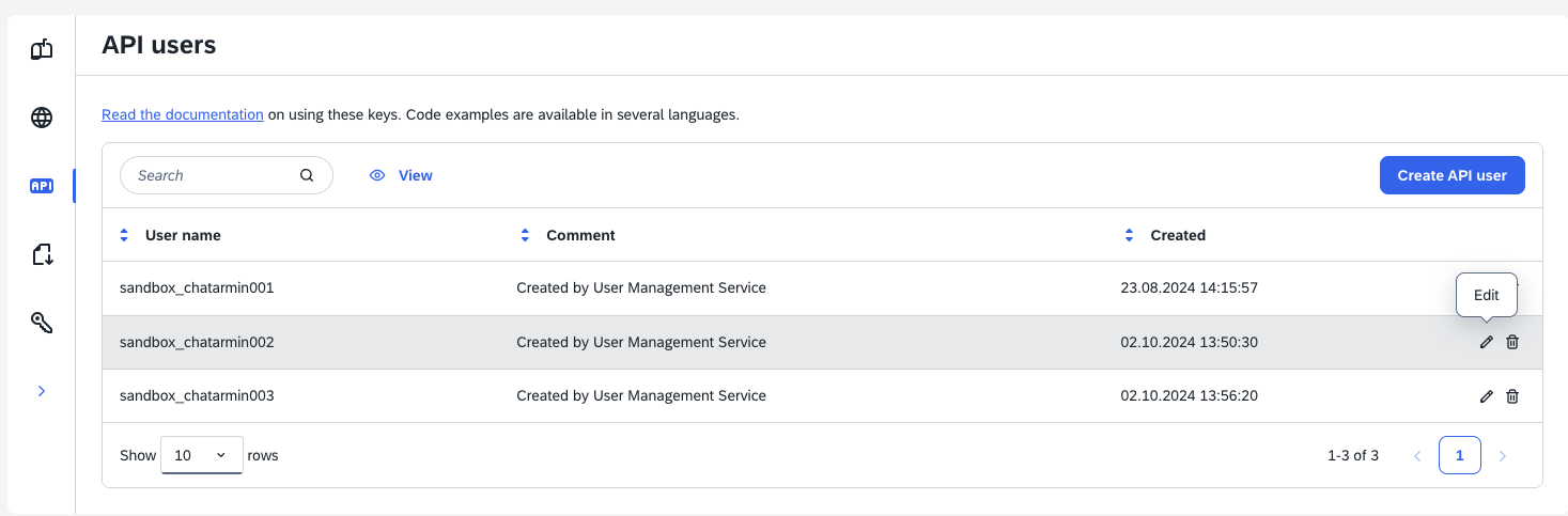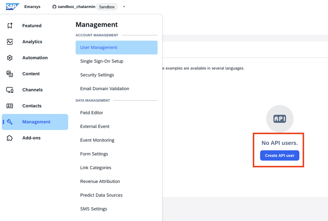 First, go to Management -> Security Settings -> API Users and click on "Create API User":