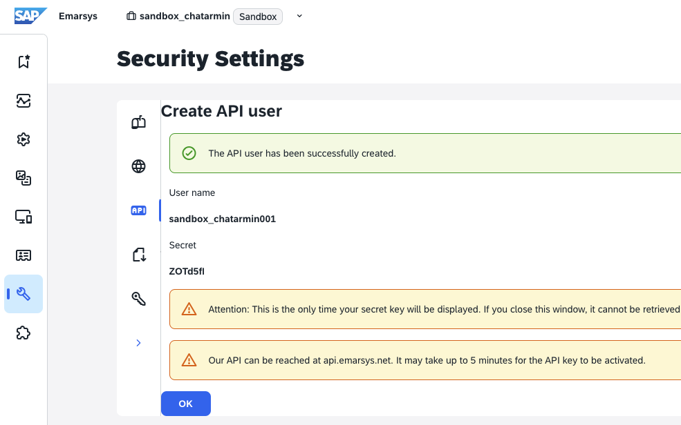 Now copy & paste the Username & Secret into the Emarsys Page inside Chatarmin: