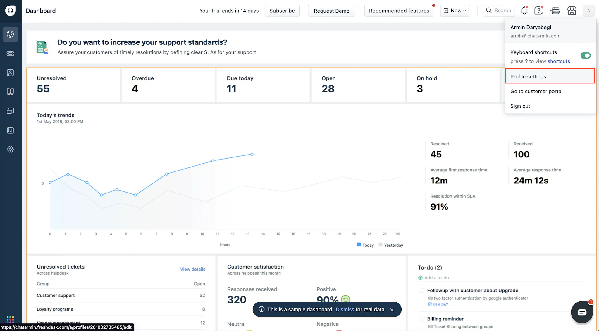 2. Log in to Freshdesk, click your profile (top right) β Profile Settings.