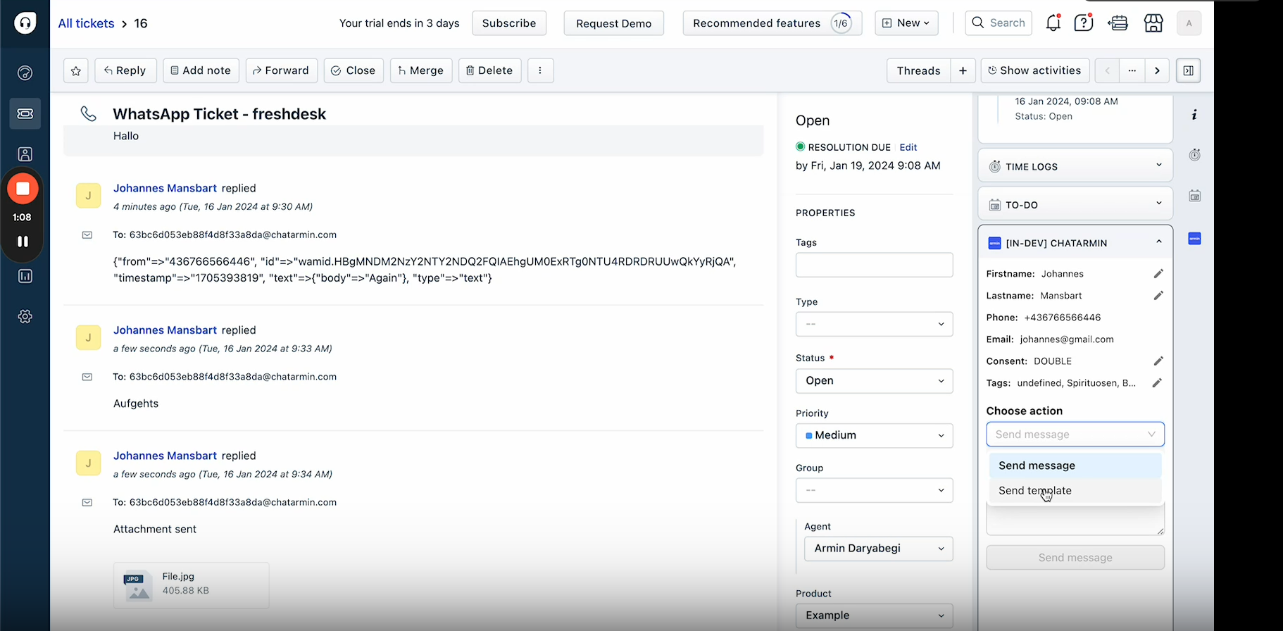 Important: Within the 24-hour messaging window, you can reply freely. After 24 hours, due to META restrictions, replies require pre-approved templates created in Chatarmin and sent via Freshdesk.
