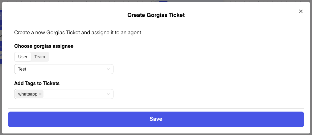 When a Gorgias ticket is created, you can assign it to specific users or a team for follow-up. This allows you to make sure that the right person or department handles the support request, streamlining the process and ensuring fast responses. To organize your support process, you can assign tags like "WhatsApp" to tickets, making it easy to identify and differentiate them from other channels.