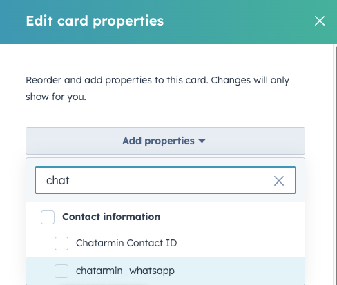 There, you’ll see all properties that are already activated and displayed for that contact. You can use Add properties to include new ones - including properties you’ve previously created in Chatarmin.