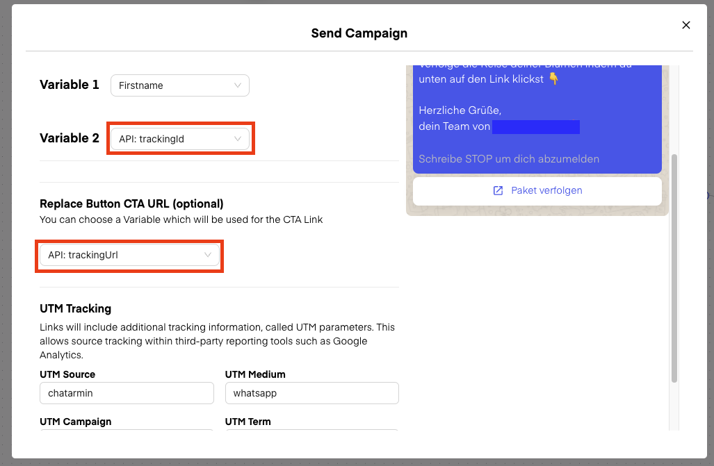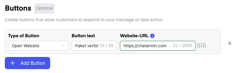 Hallo #{{1}}, dein Paket ist auf dem Weg! 📦 Deine Tracking-ID lautet: #{{2}} Verfolge die Reise deiner Blumen indem du unten auf den Link klickst 👇 Herzliche Grüße, dein Team von XXXXXAdd Website CTA Button (Website URL doesn't matter as long as its valid. It will be overwritten in the Flow by the Tracking URL anyways):