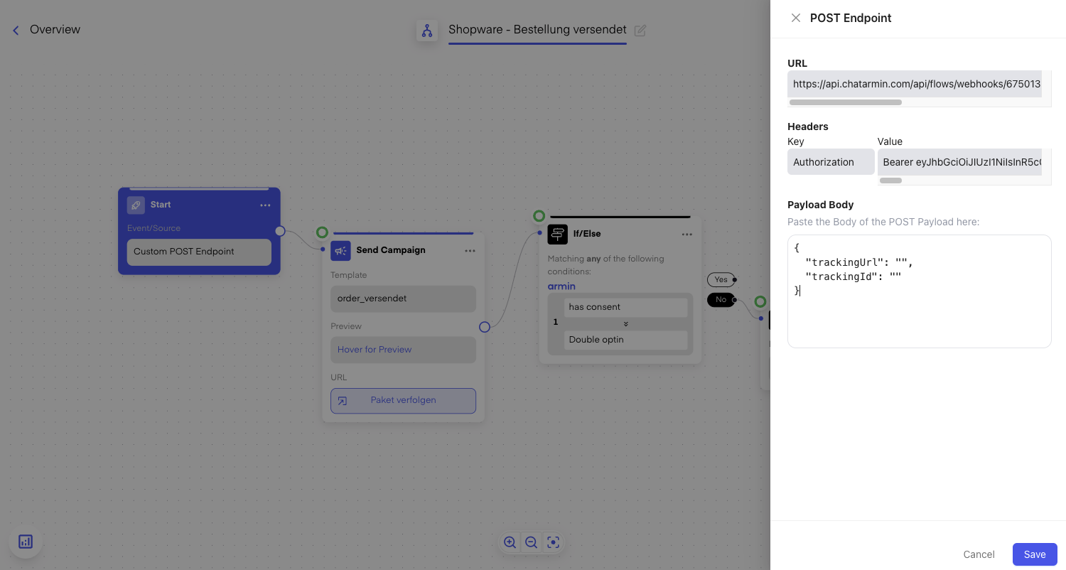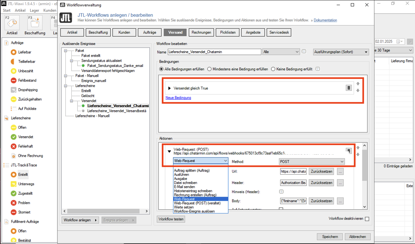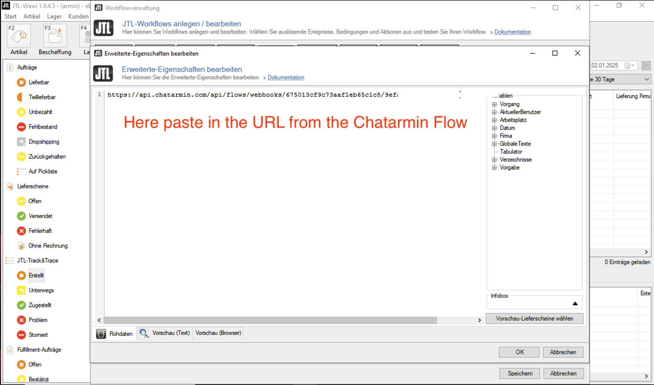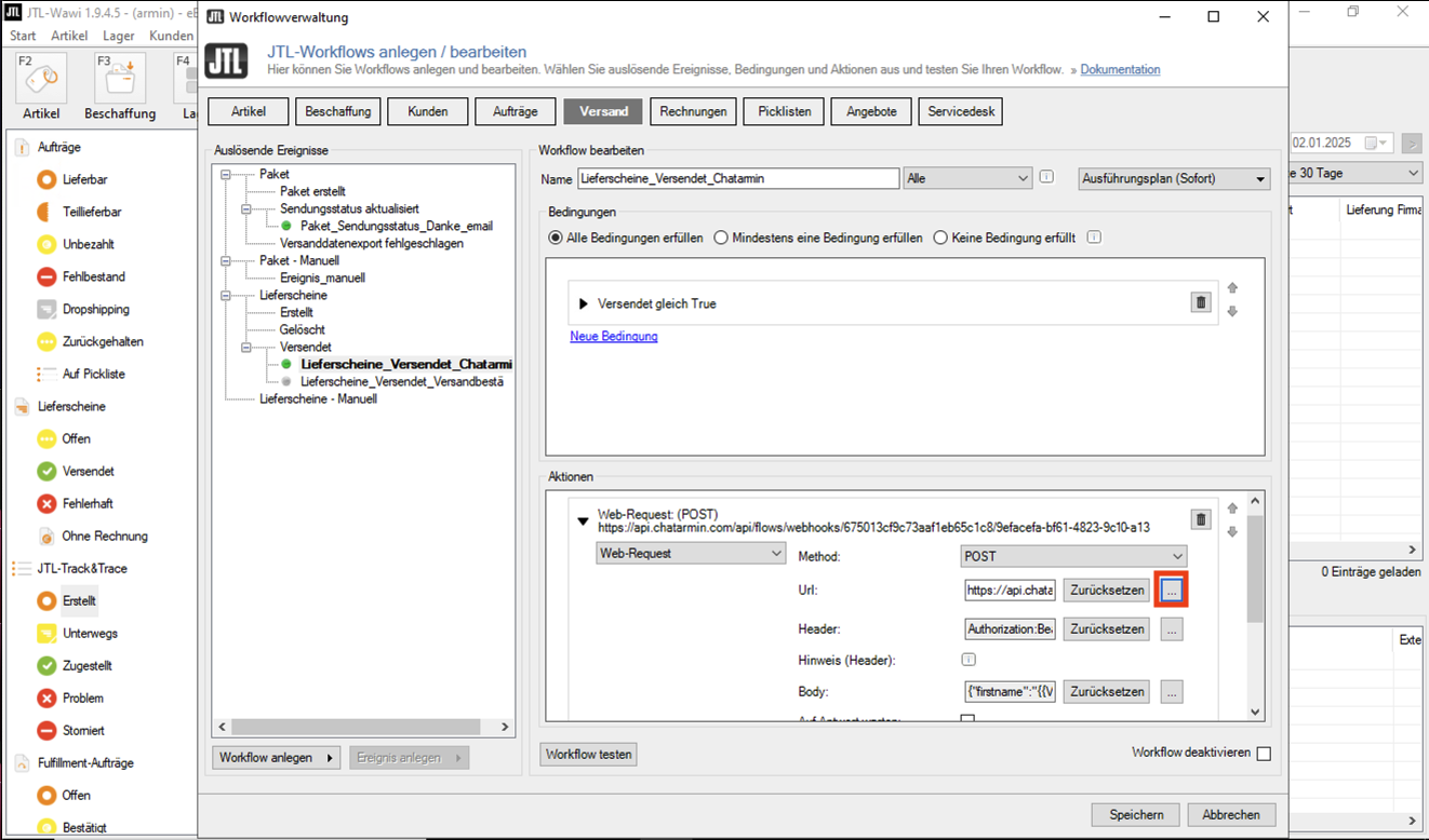 Now set the URL of the JTL Action, to the URL from the Chatarmin Flow-Trigger:
