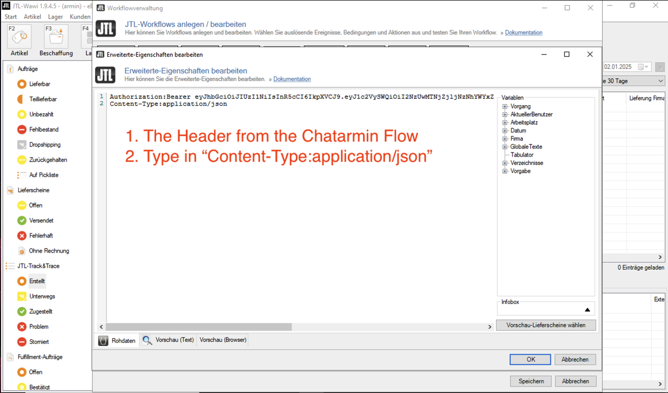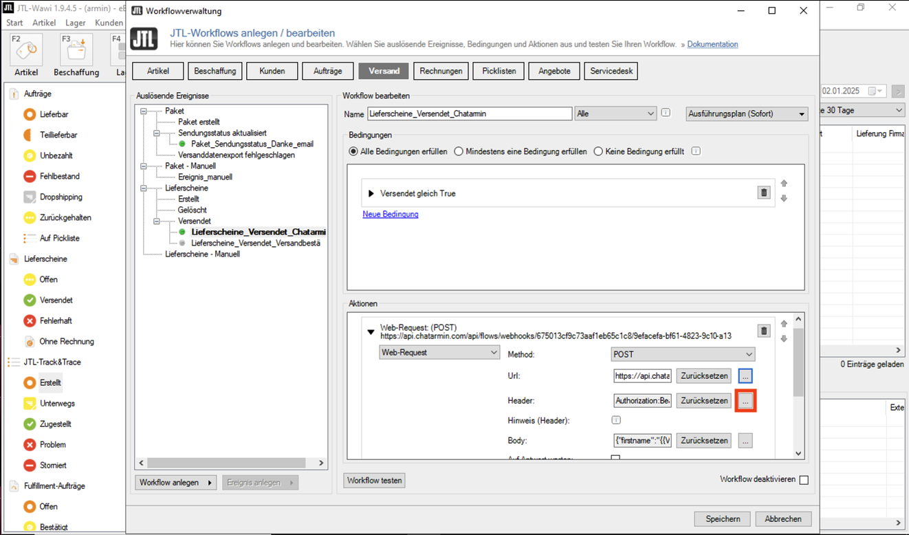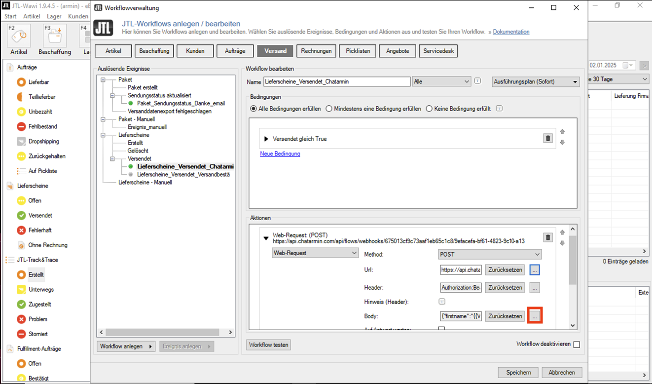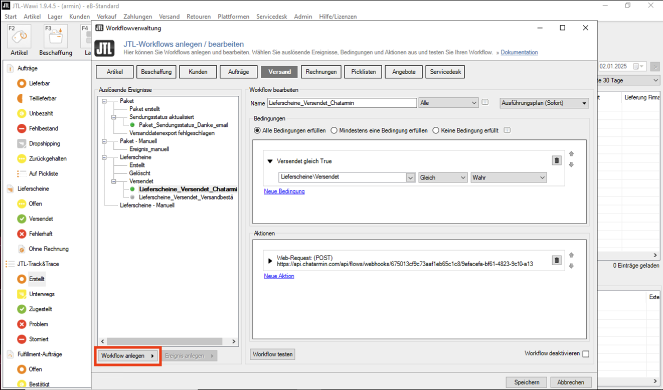 Now set the URL of the JTL Action, to the URL from the Chatarmin Flow-Trigger: