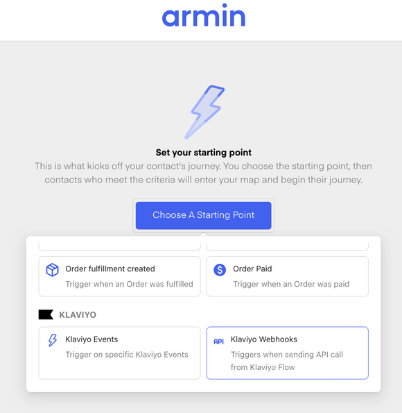 Select âKlaviyo Webhooksâ as a trigger and open the corresponding flow in Klaviyo.